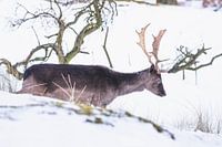 Bruin damhert met gewei in de sneeuw van Anne Zwagers