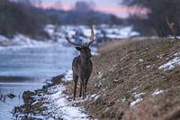 Bruin damhert met gewei in de sneeuw van Anne Zwagers