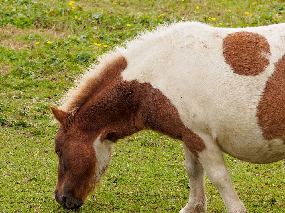 Kleine bruin en wit gevlekte shetland pony in een groen weiland