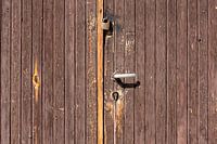 Twee houten deuren met een handvat en een hang slot en deur greep. Deur is slecht geschilderd en heeft zijn beste tijd gehad. De deuren zijn versleten en gescheurd.