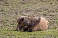 Bruin paard ligt uit te rusten op het gras in het bos.