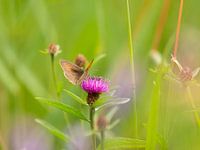 De vlinder, een bruin zandoogje, zit op de paarse bloem van knoopkruid. De foto is genomen door de begroeiing heen waardoor de vlinder en de bloem omgeven is door een waas van groen.
