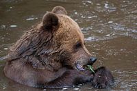 De bruine beer (Ursus arctos) is een roofdier uit de familie der beren (Ursidae) Deze dieren zijn groot en stevig gebouwd. De geslachten geven elkaar in lichaamsbouw weinig toe, maar de mannetjes worden wel dubbel zo zwaar als de meer tengere vrouwtjes. De dikke vacht is meestal donkerbruin, maar de kleur kan variëren van blond tot zwart. Aan de sterke voorpoten bevinden zich lange, niet intrekbare klauwen. Verder hebben ze een opvallende schouderbult. De lichaamslengte bedraagt 1,7 tot 2,8 m,[5] de staartlengte is 5 tot 20 cm en het gewicht 80 tot boven de 600 kg.