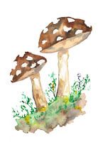 Aquarel van bruin gekleurde bospaddenstoelen die ergens in het bos groeien.