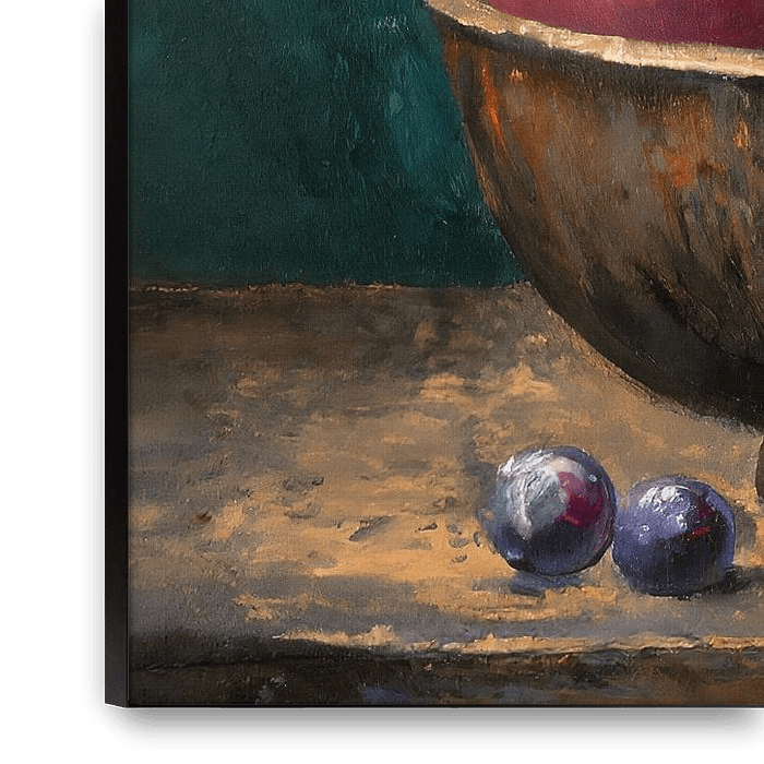 Dit is een digitaal schilderij van een bruine fruitschaal gevuld met rode druiven en appels staande op een antieke houten tafel. Op de tafel ligt ook nog een trosje duiven. De achtergrond is turkoois. Mooi in de woonkamer of de keuken.