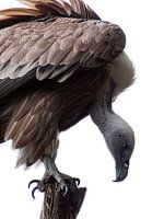 Een enorme gier staand op een tak van een overleden boom. Ondanks dat de gier naar voren buigt, is de kracht van het dier nog steeds heel goed te zien. De kleuren van de gier komen erg mooi uit tegen de witte achtergrond.