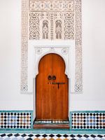 Deze foto is genomen in Marrakesh, een stad in Marokko die bekend staat om haar traditionele architectuur en rijke details. Op de foto zie je een bruine houten deur. De deur is stevig en eenvoudig van vorm, maar de omlijsting is rijk versierd. Rondom de deur zijn uitgesneden Arabische tekens en motieven zichtbaar, wat direct verwijst naar de invloed van islamitische kunst en vakmanschap in Marokkaanse architectuur.