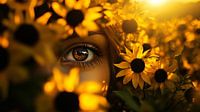 Haar mooie bruine ogen versmelten met de schoonheid van de zonnebloemen, het gouden zonlicht maakt het een krachtig geheel.