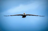 Een bruine pelikaan in vlucht tegen een blauwe lucht.