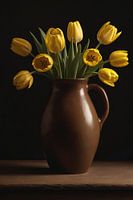Ontdek de serene schoonheid van eenvoud met dit schilderij dat de natuurlijke elegantie van gele tulpen elegant vastlegt. De bloemen zijn meesterlijk gearrangeerd in een klassieke bruine vaas, die een tijdloze aantrekkingskracht biedt. De diepgroene bladeren complementeren het warme geel, terwijl subtiele schaduwen en lichtspel het ontwerp een levensechte diepte geven. Deze afbeelding straalt rust uit en brengt een vleugje verfijnde charme in elke ruimte. Het is een perfecte aanwinst voor diegenen die houden van een ontspannen, natuurlijk palet en eenvoudige, doch prachtige composities in hun interieur.