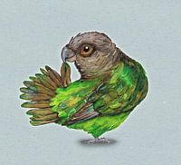 Een aquarel tekening van een Bruinkoppapegaai. Hij is bezig met zijn staart te poetsen. De achtergrond is een digitaal toegevoegde papierstructuur in een blauwige tint.