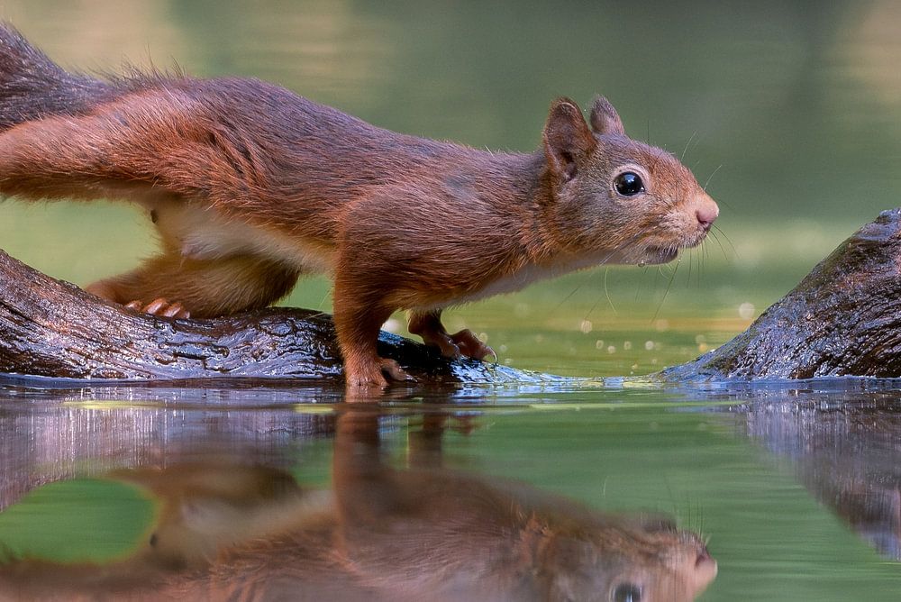 Deze eekhoorn kwam ochtends rond 9 uur wat drinken in dit beekje in het bos. Er was geen wind dus er verscheen een prachtige reflectie/weerspiegeling. Door de rustige achtergrond komt de eekhoorn erg mooi tot zn recht.
