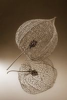 "Bruintinten: Een lampionnetje van de lampionplant" is een foto van een lampionnetje van de lampionplant die al bijna verteerd is. Het geraamte van de nerven is hierdoor mooi te zien. Op de bruin - beige kleurige ondergrond is de reflectie te zien van het lampionnetje. Door onder andere de bruine natuurlijke kleuren krijgt het geheel een rustige uitstraling.