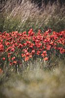 Een betoverende scène van een uitgestrekt klaprozenveld, met warme bruine tinten die een gevoel van rust en natuurlijke schoonheid oproepen. De levendige rode bloemblaadjes van de klaprozen steken af tegen het hoge gras, waardoor een opvallend visueel contrast ontstaat en het landschap gevuld wordt met een gevoel van vitaliteit en energie. Een prachtig zomers kunst voor aan de muur.