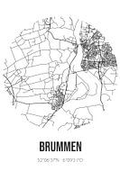 Zwart-witte landkaart, stratenplan of plattegrond van Brummen. Brummen is gelegen in de gemeente Brummen, provincie Gelderland. Op de stadskaart zijn alle openbare wegen in Brummen opgenomen. Verder is de kaart voorzien van de coördinaten van het centrum van Brummen.