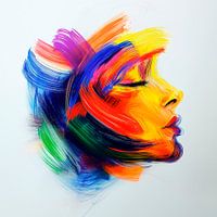 Een abstract vrouwenportret gemaakt van kleurrijke penseelstreken, met zachte schaduwen en levendige kleuren. Een harmonieuze compositie in een moderne en hedendaagse kunststijl.