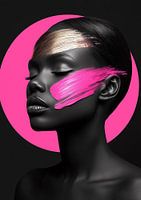 Een zwart-witfoto van een elegante vrouw met subtiele penseelstreken in roze en goud op haar gezicht, uitgevoerd in een minimalistische stijl. Achter haar hoofd is een diep roze cirkel geplaatst, die een zachte, verfijnde achtergrond vormt en de compositie een modern en stijlvol accent geeft. De combinatie van de monochrome fotografie…