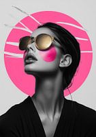 Een zwart-witfoto van een elegante vrouw met subtiele penseelstreken in roze en goud op haar gezicht, uitgevoerd in een minimalistische stijl. Achter haar hoofd is een diep roze cirkel geplaatst, die een zachte, verfijnde achtergrond vormt en de compositie een modern en stijlvol accent geeft. De combinatie van de monochrome fotografie…