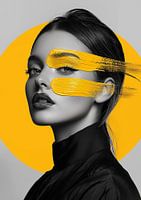 Een zwart-witfoto van een elegante vrouw, waarbij haar gezicht subtiel is geaccentueerd met penseelstreken in mosterdgeel, uitgevoerd in een minimalistische stijl. Achter haar hoofd zweeft een lichte, mosterdgele cirkel die een zachte, harmonieuze achtergrond vormt. Deze combinatie van monochrome fotografie met het warme accent van de…
