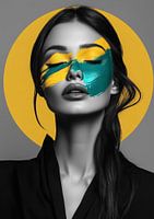 Een zwart-witfoto van een elegante vrouw, subtiel geaccentueerd met penseelstreken in mosterdgeel en teal op haar gezicht, uitgevoerd in een minimalistische stijl. Achter haar hoofd zweeft een cirkel in warme mosterdgeel, die een rustgevende, evenwichtige achtergrond creëert en de compositie een vleugje warmte en verfijning geeft. De combinatie van de monochrome fotografie met de gedurfde penseelstreken en de gele cirkel zorgt voor een verfijnd contrast dat de eenvoud van het beeld versterkt, terwijl de kleuraccenten een eigentijds en opvallend effect toevoegen.