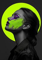 Een zwart-witfoto van een elegante vrouw, waarbij haar gezicht subtiel is geaccentueerd met penseelstreken in limoengroen en violet, uitgevoerd in een minimalistische stijl. Achter haar hoofd zweeft een zachte limoengroene cirkel, die een kalme en harmonieuze achtergrond vormt en de compositie een gevoel van frisheid en verfijning…