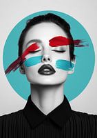 Een zwart-witfoto van een elegante vrouw, subtiel verfraaid met penseelstreken in bordeauxrood en turquoise op haar gezicht, uitgevoerd in een minimalistische stijl. Achter haar hoofd zweeft een zachte, turquoise cirkel, die een kalme en frisse achtergrond vormt en zo de compositie een gevoel van diepte en sereniteit geeft. De…