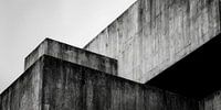 Op de foto zijn verschillende betonnen volumes zichtbaar. De vormen zijn strak en geometrisch. Het beeld is geschoten in zwart-wit, waardoor de lijnen en texturen extra opvallen. De muren zijn grof van oppervlak en tonen sporen van verwering. Het bovenaanzicht laat rechte lijnen zien die elkaar snijden. De lucht is egaal lichtgrijs, zonder afleiding.