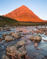 Buachaille Etive Mòr, berg bij het begin van Glen Etive. Zijn naam betekent "de grote herder van Etive". Op deze foto te zien tijdens zonsopkomst. De berg wordt prachtig oranje verlicht door de opkomende zon. Het water aan de voet van de berg is ijskoud. Deze berg staat op de grens van Glen Etive en Glencoe.