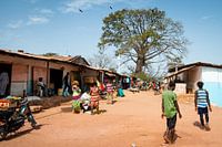 Dagelijks leven op het eiland van Bubaque, Guinee-Bissau. Een eiland vol vriendelijke mensen. Zachte kleuren door de zonsopkomst. Vrouwen dragen bont gekleurde kleding. Grote boom op de achtergrond, stoffige, zanderige grond en winkeltjes.