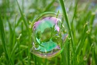 Bubble Between Grass Halms - een zeepbel opgehangen tussen verschillende grashalmen met blauwgroene, roze en paarse iriserende kleuren. en een reflectie in het midden.