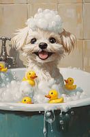 Een blije Maltese puppy die zichtbaar geniet van een schuimbad, compleet met rubberen eendjes en een vrolijke glimlach. Dit speelse kunstwerk brengt direct een glimlach in huis en geeft een frisse en luchtige uitstraling aan elk interieur. Onderdeel van de serie Bubbels & Beesten, waarin dieren in een bad vol schuim de hoofdrol…