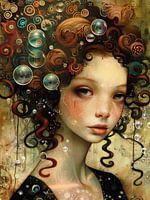 Bubble Realms - Dit surrealistische vrouwenschilderij toont een jonge vrouw waarvan het haar en gezicht versierd zijn met levendige, kleurrijke patronen en drijvende zeepbellen, waarbij elke bubbel eigen unieke, miniature werelden lijkt te bevatten.