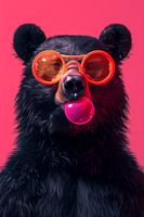 De vrolijke beer, met een diepzwarte vacht, draagt een paar opvallende oranje zonnebrillen die een speelse noot aan zijn verschijning geven. Hij blaast een glanzende roze kauwgombal, wat bijdraagt aan het unieke en…