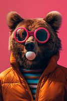 De vrolijke beer, met een diepbruine vacht, heeft een paar felroze ronde zonnebrillen op en blaast een kauwgombal, wat een grappig en onverwacht beeld creëert tegen de felroze achtergrond. De beer draagt een…