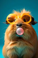 De cavia, met een pluizige oranje-bruine vacht, is uitgedost met een paar opvallende gele ronde zonnebrillen. Midden in het beeld blaast de cavia een doorschijnende roze kauwgombal, wat een speels element toevoegt…