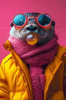 Met grote, expressieve ogen die door ronde, oranje omlijste glazen van zijn bril kijken, straalt de otter een gevoel van verwondering en speelsheid uit. De vrolijke otter is gehuld in een felgele winterjas die scherp afsteekt tegen de zachtroze sjaal die zijn nek verwarmt. Een lichtgevende, bijna doorschijnende kauwgombel hangt aan zijn snuit, wat de afbeelding een speels en jeugdig karakter geeft.