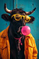 Het vrolijke, krachtige dier, meestal geassocieerd met kracht en onstuimigheid, is hier neergezet als een modieuze figuur uit de popcultuur. Met een felgele zonnebril die zijn ogen vergroot, een bijpassende gele regenjas, en een roze kauwgombal die hij nonchalant blaast, straalt de stier een relaxte coolheid uit. De pastel roze kauwgombal vormt een levendig contrast met de donkere vacht van de stier en de gele accenten van zijn outfit. De achtergrond is een rustig blauw, dat het geheel een frisse en moderne uitstraling geeft. Dit kunstwerk speelt met de tegenstellingen en creëert een humoristisch beeld dat zowel verrast als charmeert.