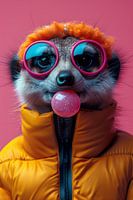 Het vrolijke stokstaartje draagt een paar grote, roze omrande zonnebrillen met reflecterende oranje glazen, die een speels contrast vormen met zijn natuurlijke kleuren. Een grote, roze kauwgombel lijkt net uit zijn mond te komen, wat een gevoel van jeugdige ondeugendheid geeft. Het stokstaartje is gekleed in een felgele, gevoerde winterjas, wat een extra laag van antropomorfisme en humor toevoegt.