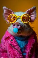 Het vrolijke varken, met zijn zachte roze vacht, draagt een felroze jas die hem een knusse en verzorgde uitstraling geeft. De dikke gebreide trui in contrasterend blauw voegt diepte en textuur toe aan het beeld. De gele ronde bril met grote glazen geeft het varken een modieus en ietwat excentriek karakter. De kauwgombal, nonchalant uitgeblazen, voegt een speels element toe dat zowel humor als luchtigheid brengt. De compositie is zorgvuldig gekozen; het varken kijkt rechtstreeks in de camera met een blik die zowel nieuwsgierigheid als zelfverzekerdheid uitstraalt. Het gebruik van levendige kleuren en de aandacht voor detail in de textuur van de vacht en kleding maken het kunstwerk een feest voor het oog.