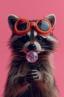 De vrolijke wasbeer, gekleed in zijn natuurlijke vacht, is afgebeeld met een paar oversized, oranje gekleurde bril die een menselijk element toevoegt aan zijn verschijning. Hij is gevangen in het moment van het blazen van een transparante, glinsterende kauwgombal, wat een jeugdig en zorgeloos gevoel geeft. De achtergrond is een zacht roze kleur die de afbeelding een warme, vriendelijke sfeer geeft en de wasbeer laat opvallen. De details van de vacht zijn met grote zorg weergegeven, van de fijne haren rond zijn gezicht tot de grovere textuur op zijn lichaam. De compositie van het beeld, met de wasbeer die rechtstreeks naar de kijker kijkt, creëert een directe connectie en nodigt uit tot een glimlach.