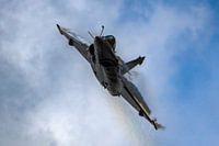 Kapitein Bertrand Butin met de Dassault Rafale C van de Franse luchtmacht demonstreert de mogelijkheden van dit vliegtuig tijdens de Royal International Air Tattoo in Fairford in het Verenigd Koninkrijk.