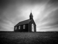 Búðakirkja is een traditioneel klein zwart kerkje op het schiereiland Snæfellsnes, een van de vele prachtige kleine kerken in IJsland. Foto genomen met een lange sluitertijd om het effect in de lucht te krijgen.