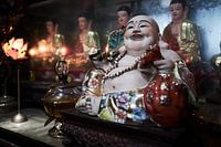 Buddha in Vietnamese tempel. Mooi versierde buddha met in achtertgrond meer religieuze beeldjes