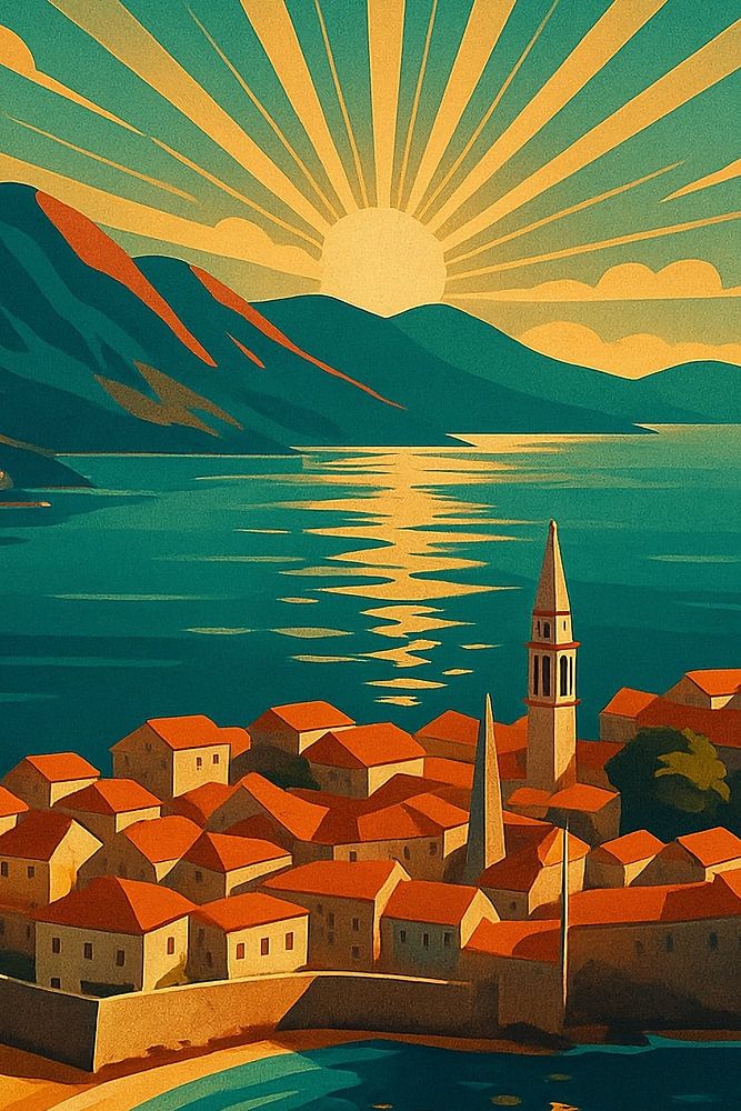 Deze Budva Art Deco poster viert het Adriatische juweel van Montenegro met een gedurfde retrostijl en kustcharme. Budva staat bekend om haar middeleeuwse oude stad, gouden stranden en prachtige zonsondergangen en is een van de meest geliefde bestemmingen langs de Balkankust. Het kunstwerk benadrukt de vestingstad met haar rode daken die oplichten in warm zonlicht, omlijst door gestileerde stralen die weerkaatsen over de turquoise zee. Ontworpen in de traditie van klassieke vintage reisposters, combineert deze print geometrische compositie en rijke kleuren om tijdloze elegantie op te roepen. Perfect voor reizigers, verzamelaars en interieurliefhebbers, deze Budva muurkunst transformeert elke ruimte met mediterrane warmte en culturele diepgang. Of je nu door de stenen straten hebt gewandeld of droomt van Adriatische avonturen, dit kunstwerk brengt de sfeer van de kust van Montenegro in je huis. Een opvallende keuze voor liefhebbers van retro posters, Europese wanddecoratie en Balkan reiskunst.