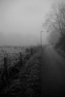 Verander je huis in een oase van rust en contemplatie met deze bijzondere canvasprint. Het sfeervolle zwart-wit motief toont een eenzaam pad dat zich een weg baant door een mistig landschap. Een enkele lantaarnpaal verlicht het pad, terwijl een eenzame wandelaar in de verte verdwijnt. De kale bomen en het hoge gras langs het pad versterken de melancholische en mysterieuze sfeer.