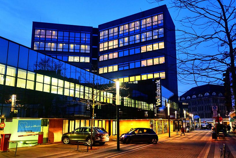 Blauw uur in Gelsenkirchen-Buer. Hier de Volksbank