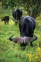 De voorste buffel heeft zijn hoofd naar beneden waardoor heel mooi de enorme horens te zien zijn.