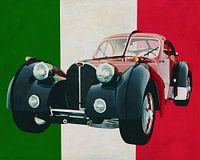 Dit schilderij van de Bugatti Atlantic, gebouwd in 1930, met de Italiaanse vlag op de achtergrond is te koop in verschillende maten en kan zowel op doek als op hout en metaal worden afgedrukt. U kunt het schilderij ook laten afwerken met een acrylplaat er overheen waardoor het meer diepte krijgt.