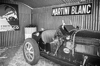 Bugatti Type 35 klassieke racewagen tentoongesteld in een oude loods met automobilia op de. achtergrond. De Bugatti Type 35 was een zeer succesvolle racewagen in zijn tijd en werd geproduceerd in een aantal verschillende versies.