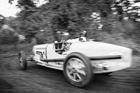 Bugatti Type 45 Bi-Place Course 1929 raceauto die deelneemt aan een sprintrace in zwart-wit.